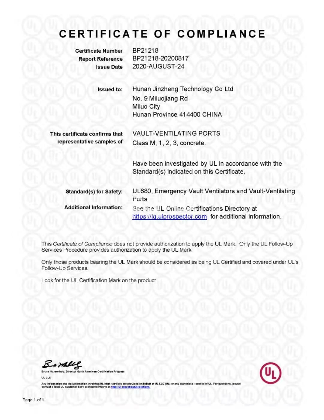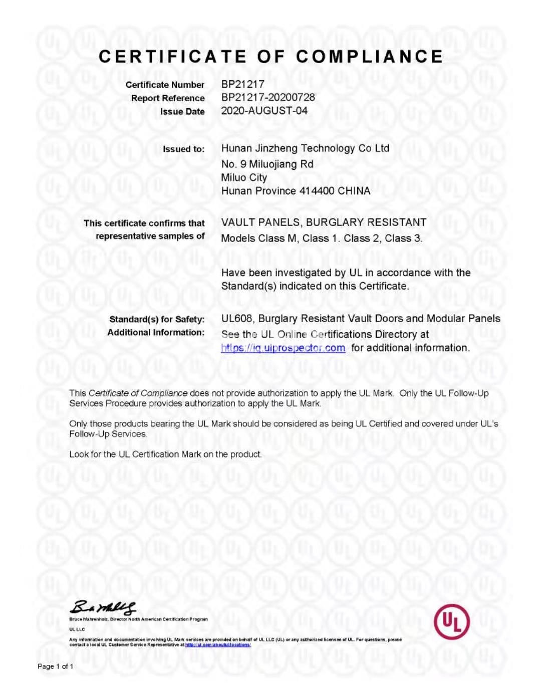 湖南樱桃视频免费科技有限公司生產的樱桃短视频在线观看、金庫壁板、金庫通風口三款產品成功通過美國UL-608全係列認證(M級、1級、2級、3級)
